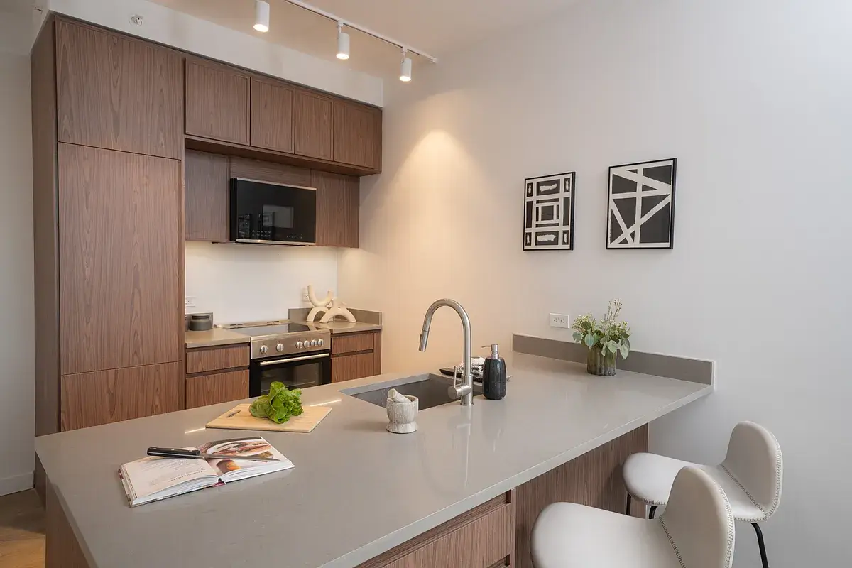 The Bruckner House is a tribute to sustainable architecture. In conversation with the past, the architect uses traditional red brick alongside environmentally conscious materials to re-interpret Mott Haven & New York architecture.The building pays homage to the area’s industrial past, using materials from across the country. In its communal spaces, members enjoy rich oak paneling and quartered glass combined with exposed concrete for a luxurious and inviting living experience.