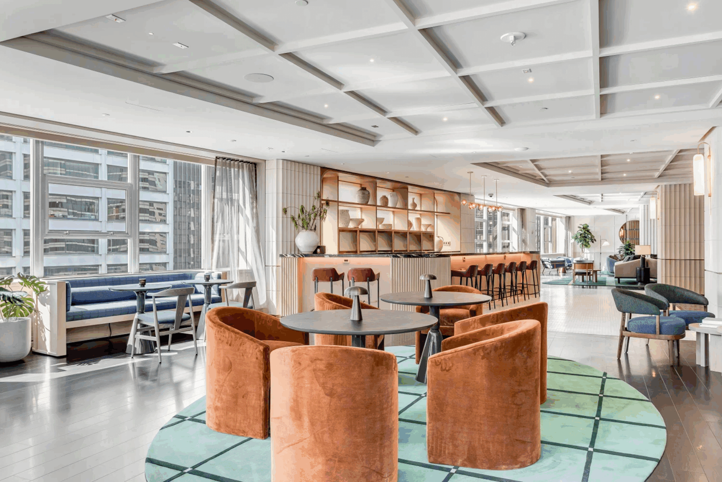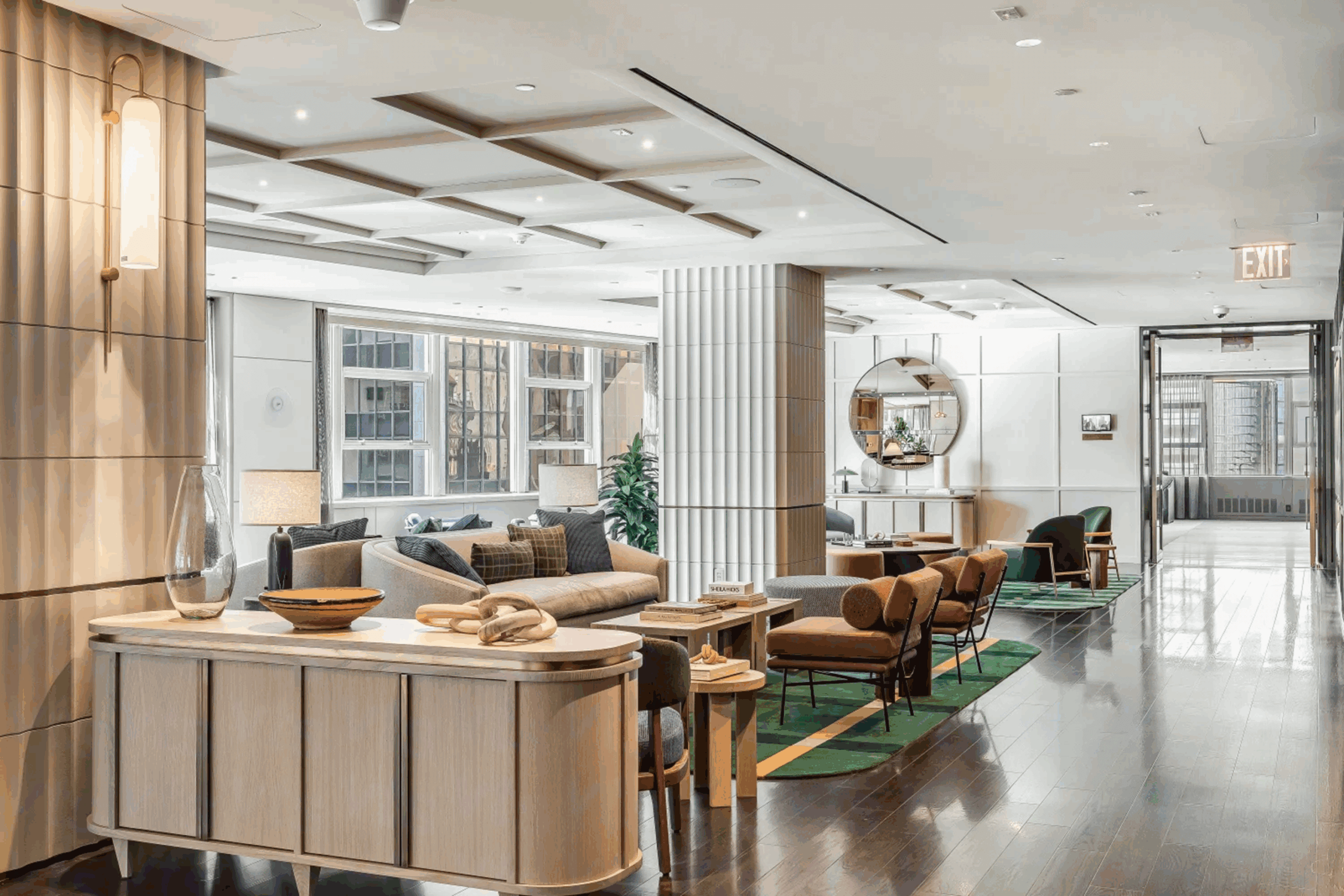 The building property at the address 80 Pine Street occupies a whole block and can be found between Pearl & Water Streets in Manhattan’s Financial District. The commercial high rise has been updated to a modern contemporary standard and enjoys a new main entrance that offers a great presence at street level incorporating a luminous glass frieze which helps to draw the eye inward to the building’s new recessed entrance – now the building stands as its been put “a beacon at the end of Cedar Street”
