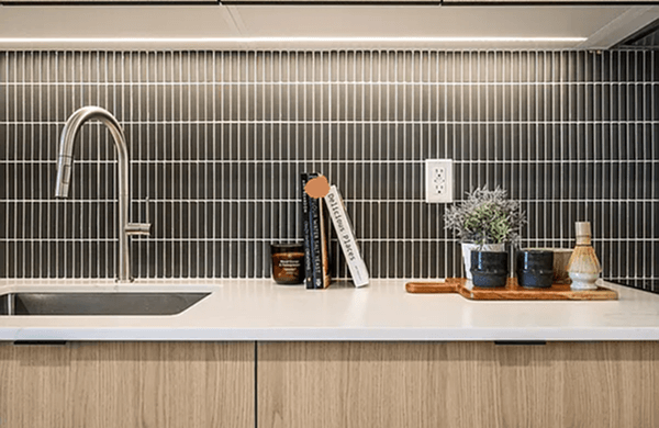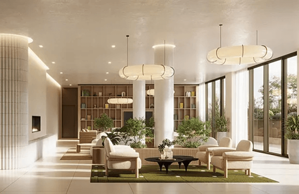 The building offers studio to two-bedroom residences—many with dedicated home office spaces—each featuring floor-to-ceiling windows, in-unit washer/dryers, and elegant modern finishes designed for comfort and flexibility.