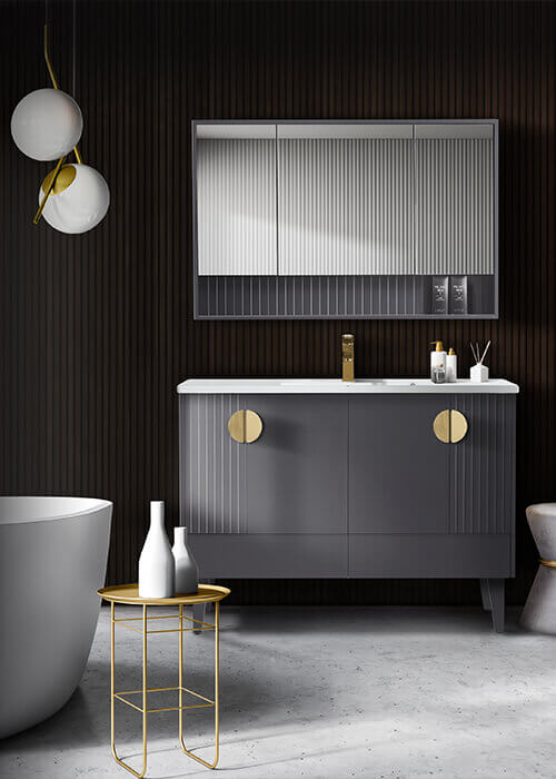 A timeless classic, Venezia merges some of Italy’s most glamorous designs with modern trends and architectural updates. Sitting pretty on cone shaped legs, it’s squared in design features an off center cabinet display, with linear strips in vertical formation. Modern art in all its glory, Venezia surpasses the ordinary expectations in bathroom vanity performance, brilliantly merging functionality with geometric outlines and a split circular metal opening. Conforms to all transitional, traditional and modern design plans.